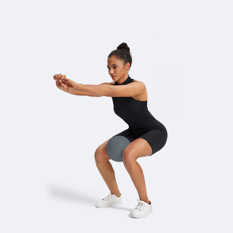 Stand tall and squeeze the ball between your knees. Squat to a 90-degree angle. Make sure not to drive the knees over your toes. As you squat, raise your extended arms. Repeat the movement.