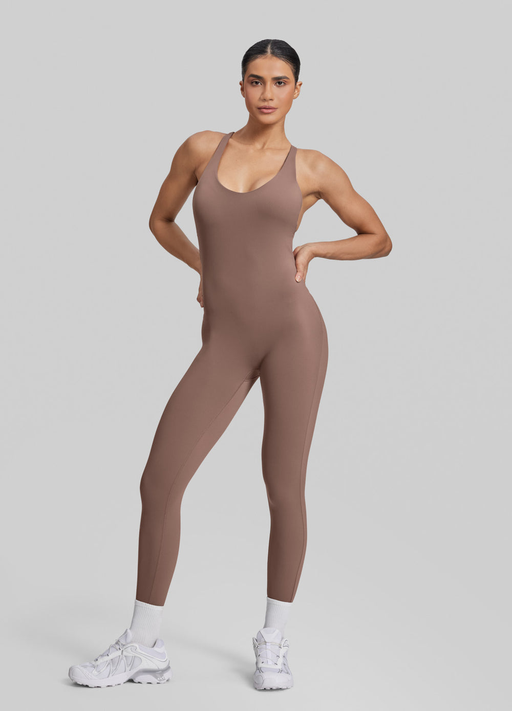 Form-Fitting Full Length Crossback Built-in Bra Sweat-Wicking Bodysuit