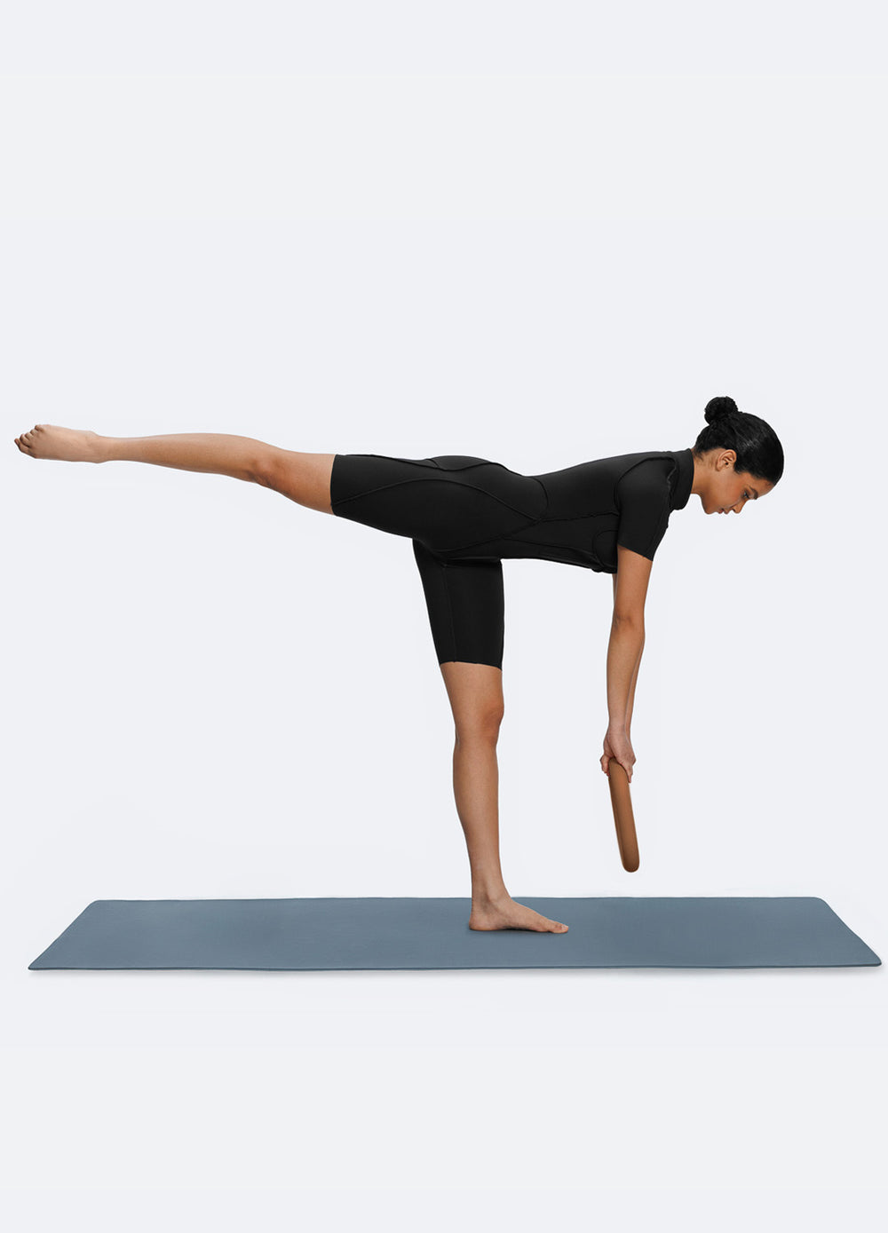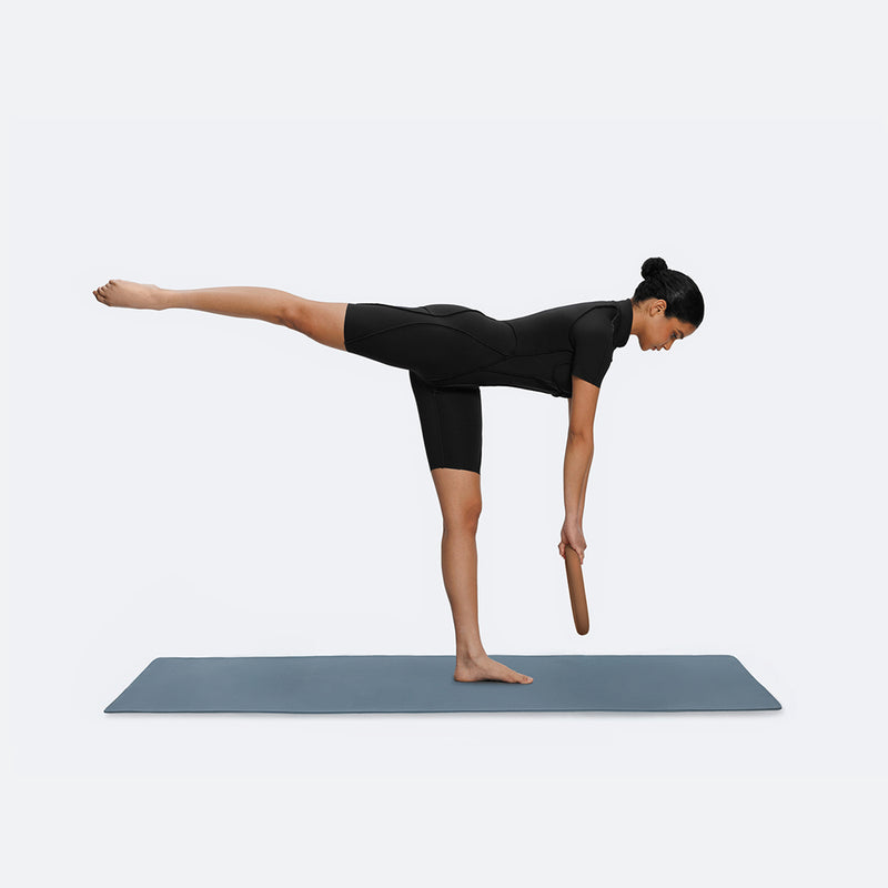 Станьте на ліву ногу та тримайте кільце опору на рівні стегон. Намагайтесь утримувати рівновагу. Опустіть корпус і одночасно витягніть праву ногу назад. Нахиляючись, опускайте кільце до підлоги. Повторіть.