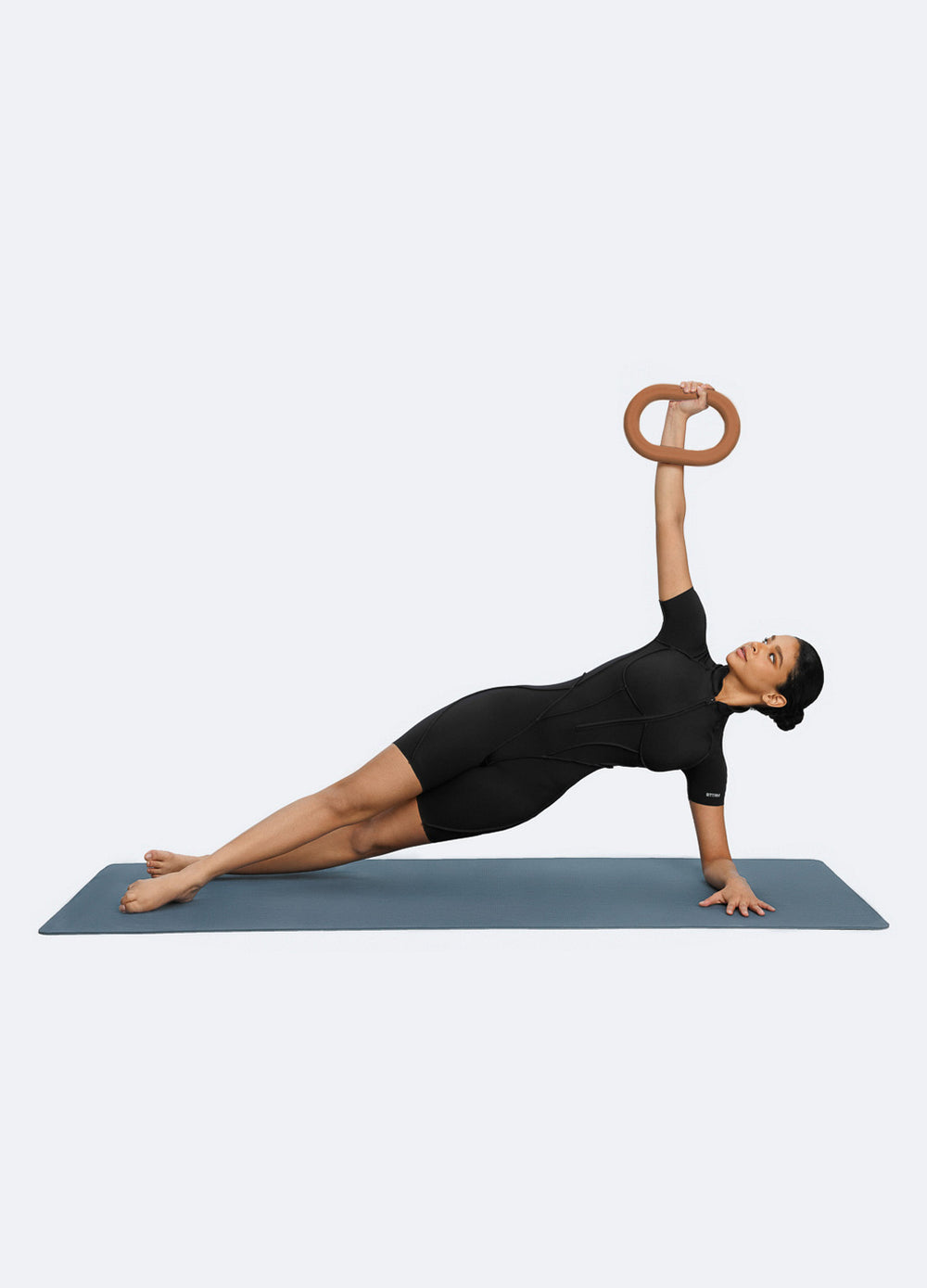 Станьте в бічну планку на лівій руці. Тримайте спину прямою і розмістіть щиколотки хрест-навхрест для балансу. Правою рукою тримайте кільце опору перед собою. Підніміть його над головою, повністю випрямивши руку. Слідуйте поглядом за кільцем. Опустіть і повторіть.